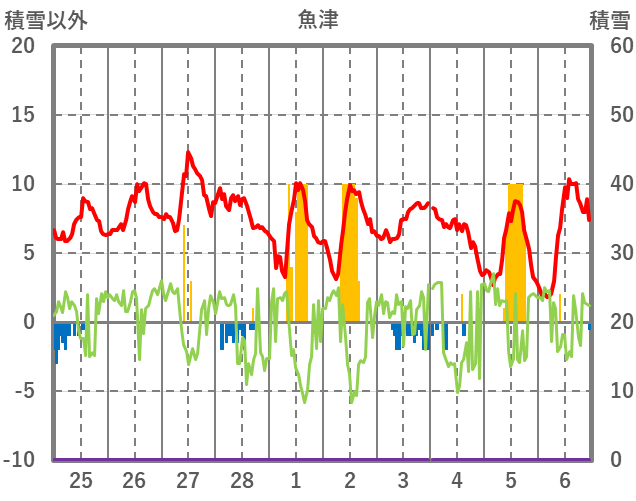 | 日 | 時 | 気温 | 降水 | 風向/風速 | 日照 | 積雪 | 降雪 |