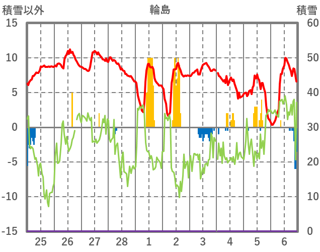 | 日 | 時 | 気温 | 降水 | 風向/風速 | 日照 | 積雪 | 降雪 |