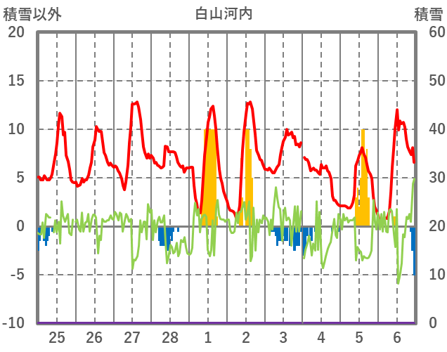 | 日 | 時 | 気温 | 降水 | 風向/風速 | 日照 | 積雪 | 降雪 |