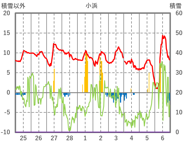 | 日 | 時 | 気温 | 降水 | 風向/風速 | 日照 | 積雪 | 降雪 |