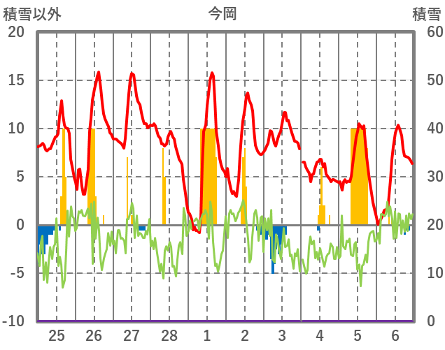 | 日 | 時 | 気温 | 降水 | 風向/風速 | 日照 | 積雪 | 降雪 |