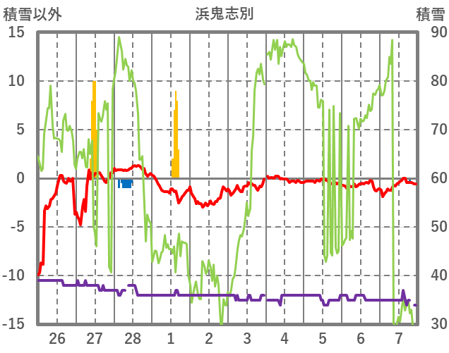 | 日 | 時 | 気温 | 降水 | 風向/風速 | 日照 | 積雪 | 降雪 |