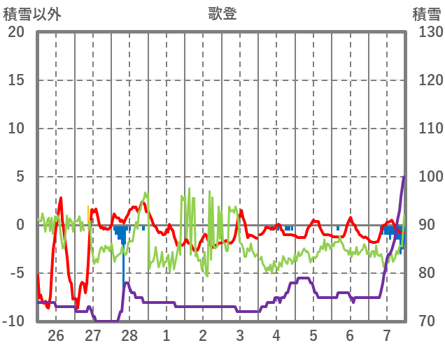 | 日 | 時 | 気温 | 降水 | 風向/風速 | 日照 | 積雪 | 降雪 |