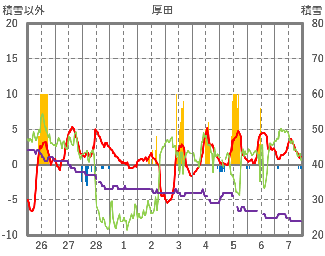 | 日 | 時 | 気温 | 降水 | 風向/風速 | 日照 | 積雪 | 降雪 |