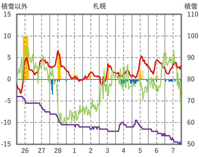 | 日 | 時 | 気温 | 降水 | 風向/風速 | 日照 | 積雪 | 降雪 |