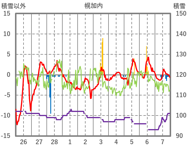 | 日 | 時 | 気温 | 降水 | 風向/風速 | 日照 | 積雪 | 降雪 |