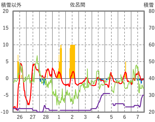 | 日 | 時 | 気温 | 降水 | 風向/風速 | 日照 | 積雪 | 降雪 |