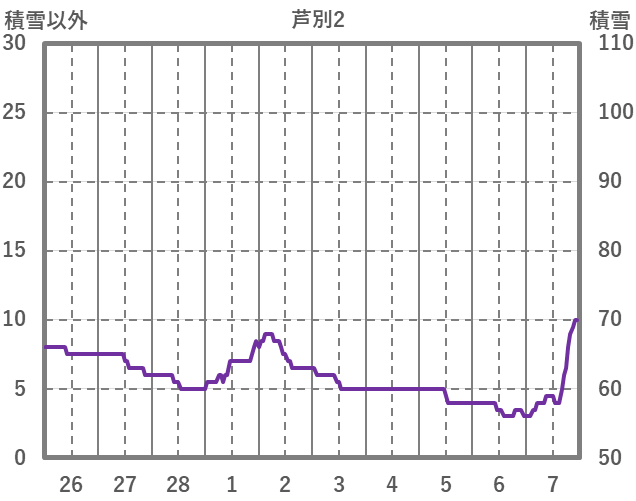 | 日 | 時 | 気温 | 降水 | 風向/風速 | 日照 | 積雪 | 降雪 |