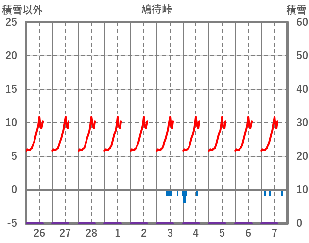 | 日 | 時 | 気温 | 降水 | 風向/風速 | 日照 | 積雪 | 降雪 |