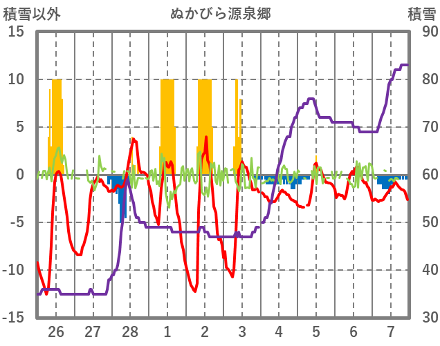 | 日 | 時 | 気温 | 降水 | 風向/風速 | 日照 | 積雪 | 降雪 |
