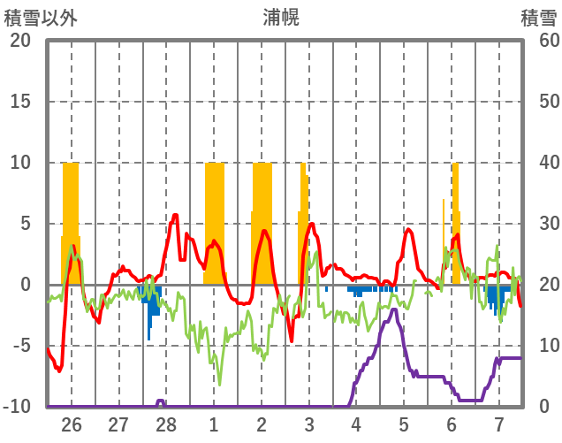 | 日 | 時 | 気温 | 降水 | 風向/風速 | 日照 | 積雪 | 降雪 |
