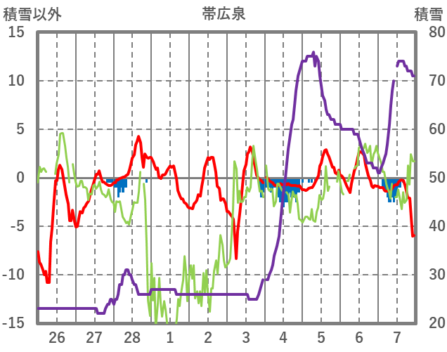 | 日 | 時 | 気温 | 降水 | 風向/風速 | 日照 | 積雪 | 降雪 |