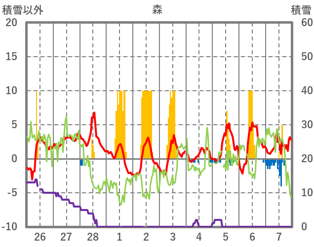 | 日 | 時 | 気温 | 降水 | 風向/風速 | 日照 | 積雪 | 降雪 |