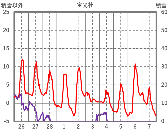 | 日 | 時 | 気温 | 降水 | 風向/風速 | 日照 | 積雪 | 降雪 |