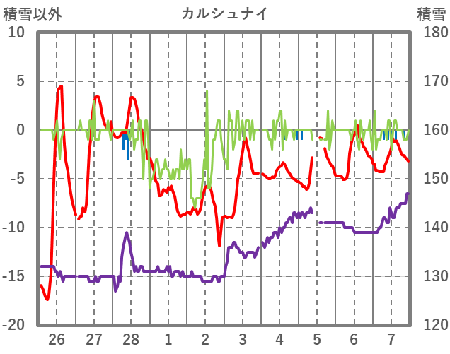 | 日 | 時 | 気温 | 降水 | 風向/風速 | 日照 | 積雪 | 降雪 |