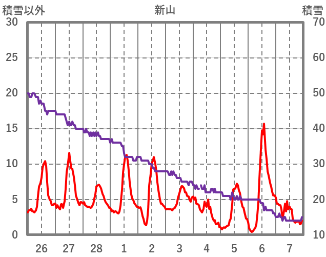 | 日 | 時 | 気温 | 降水 | 風向/風速 | 日照 | 積雪 | 降雪 |