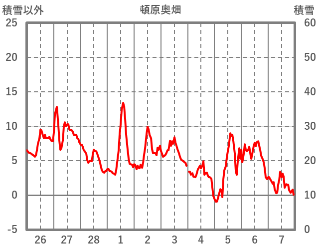 | 日 | 時 | 気温 | 降水 | 風向/風速 | 日照 | 積雪 | 降雪 |