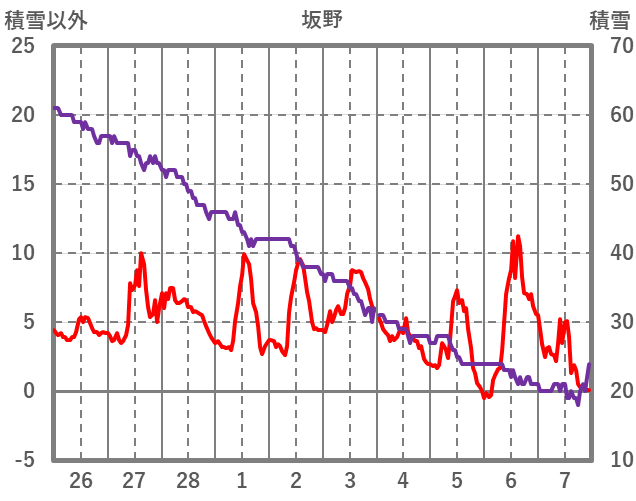 | 日 | 時 | 気温 | 降水 | 風向/風速 | 日照 | 積雪 | 降雪 |