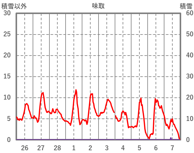 | 日 | 時 | 気温 | 降水 | 風向/風速 | 日照 | 積雪 | 降雪 |