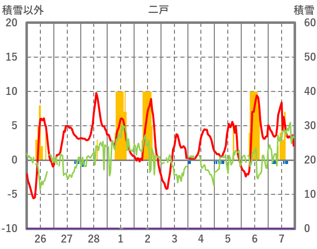 | 日 | 時 | 気温 | 降水 | 風向/風速 | 日照 | 積雪 | 降雪 |