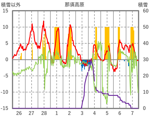 | 日 | 時 | 気温 | 降水 | 風向/風速 | 日照 | 積雪 | 降雪 |