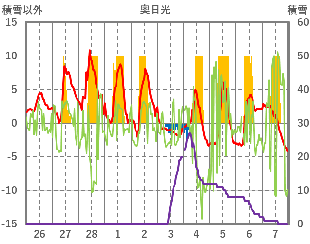 | 日 | 時 | 気温 | 降水 | 風向/風速 | 日照 | 積雪 | 降雪 |