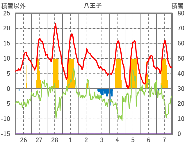 | 日 | 時 | 気温 | 降水 | 風向/風速 | 日照 | 積雪 | 降雪 |