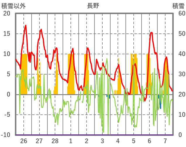 | 日 | 時 | 気温 | 降水 | 風向/風速 | 日照 | 積雪 | 降雪 |