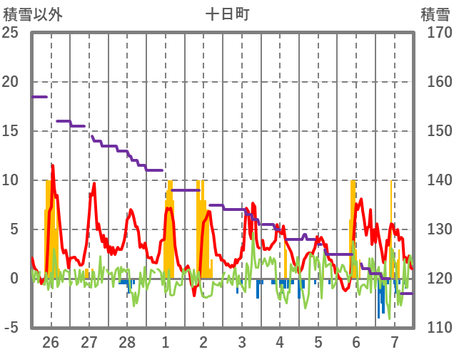 | 日 | 時 | 気温 | 降水 | 風向/風速 | 日照 | 積雪 | 降雪 |