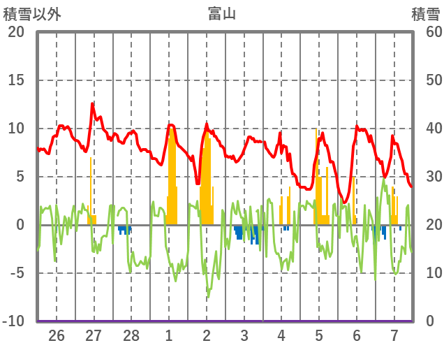 | 日 | 時 | 気温 | 降水 | 風向/風速 | 日照 | 積雪 | 降雪 |