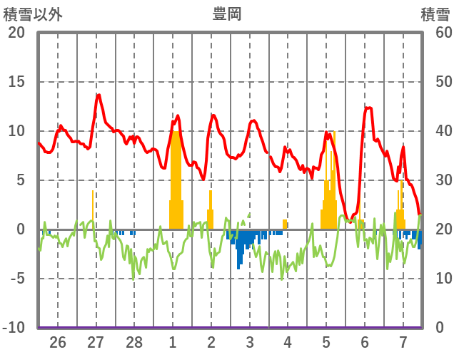 | 日 | 時 | 気温 | 降水 | 風向/風速 | 日照 | 積雪 | 降雪 |