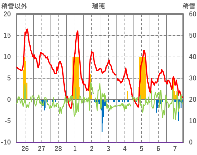 | 日 | 時 | 気温 | 降水 | 風向/風速 | 日照 | 積雪 | 降雪 |