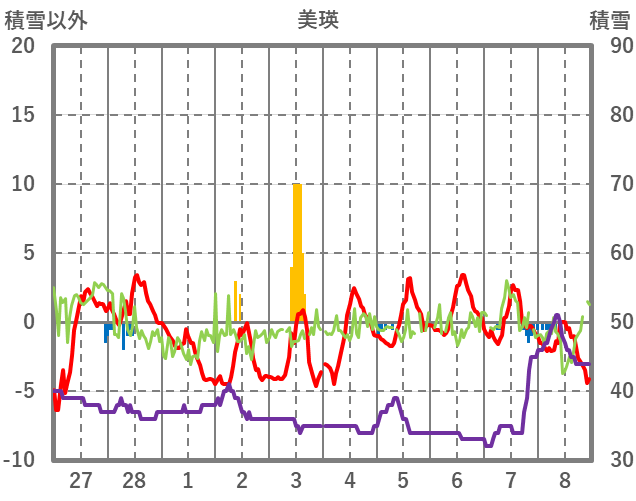 | 日 | 時 | 気温 | 降水 | 風向/風速 | 日照 | 積雪 | 降雪 |