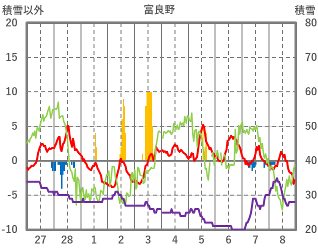 | 日 | 時 | 気温 | 降水 | 風向/風速 | 日照 | 積雪 | 降雪 |