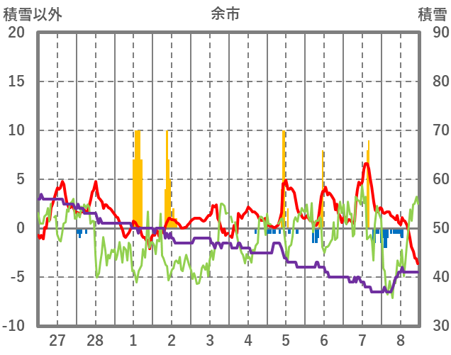 | 日 | 時 | 気温 | 降水 | 風向/風速 | 日照 | 積雪 | 降雪 |