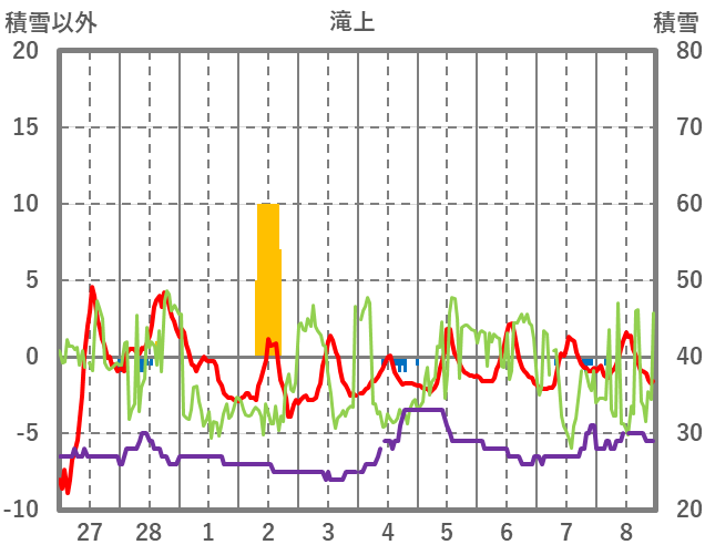 | 日 | 時 | 気温 | 降水 | 風向/風速 | 日照 | 積雪 | 降雪 |