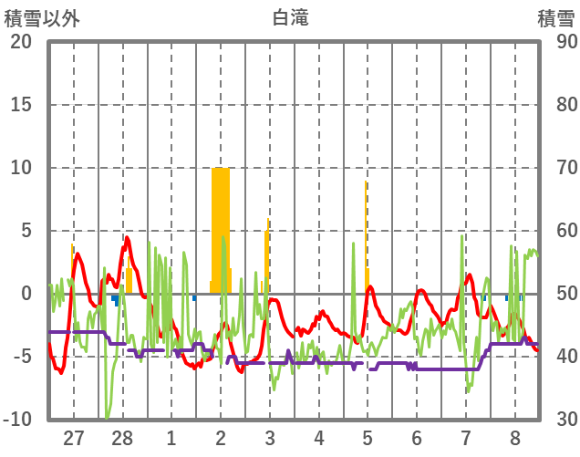 | 日 | 時 | 気温 | 降水 | 風向/風速 | 日照 | 積雪 | 降雪 |