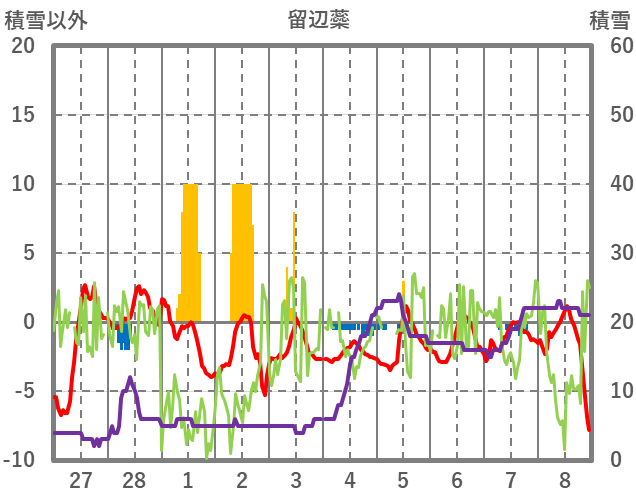 | 日 | 時 | 気温 | 降水 | 風向/風速 | 日照 | 積雪 | 降雪 |