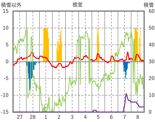 | 日 | 時 | 気温 | 降水 | 風向/風速 | 日照 | 積雪 | 降雪 |