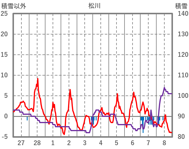 | 日 | 時 | 気温 | 降水 | 風向/風速 | 日照 | 積雪 | 降雪 |