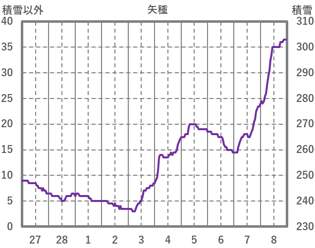 | 日 | 時 | 気温 | 降水 | 風向/風速 | 日照 | 積雪 | 降雪 |