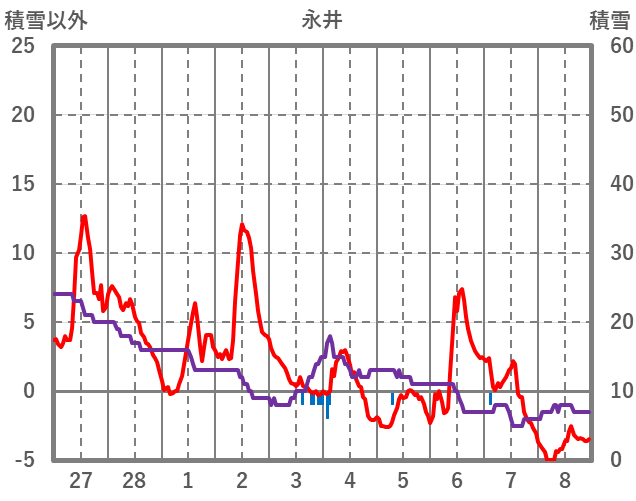 | 日 | 時 | 気温 | 降水 | 風向/風速 | 日照 | 積雪 | 降雪 |