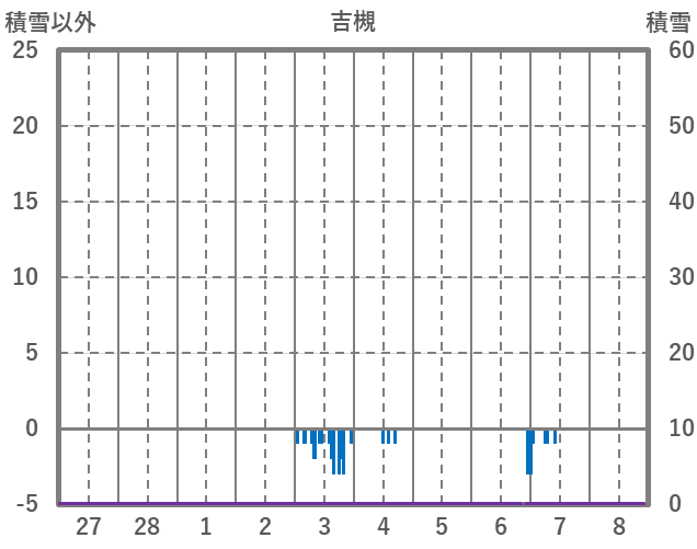 | 日 | 時 | 気温 | 降水 | 風向/風速 | 日照 | 積雪 | 降雪 |