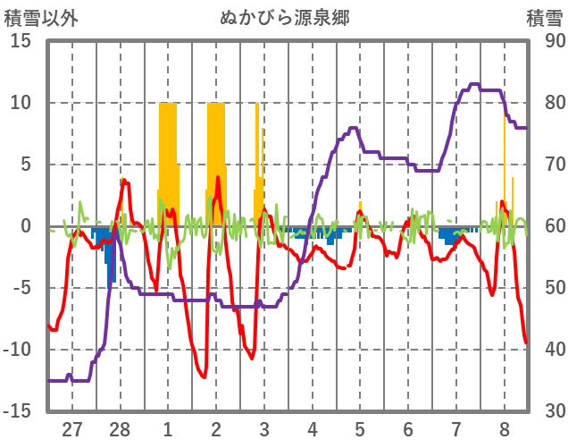 | 日 | 時 | 気温 | 降水 | 風向/風速 | 日照 | 積雪 | 降雪 |