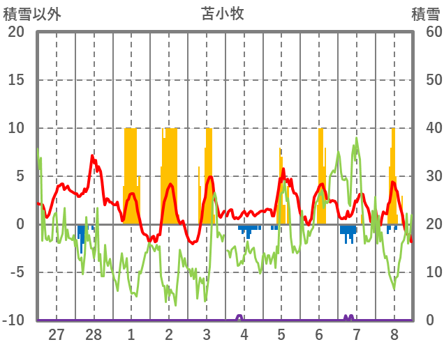 | 日 | 時 | 気温 | 降水 | 風向/風速 | 日照 | 積雪 | 降雪 |