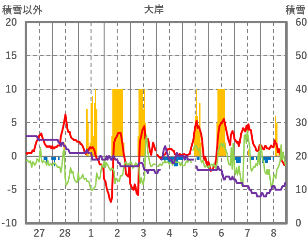 | 日 | 時 | 気温 | 降水 | 風向/風速 | 日照 | 積雪 | 降雪 |