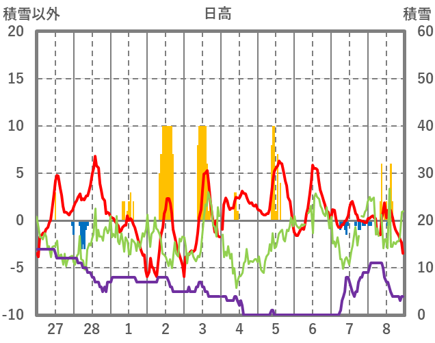 | 日 | 時 | 気温 | 降水 | 風向/風速 | 日照 | 積雪 | 降雪 |