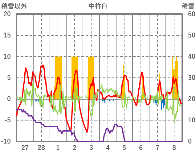 | 日 | 時 | 気温 | 降水 | 風向/風速 | 日照 | 積雪 | 降雪 |