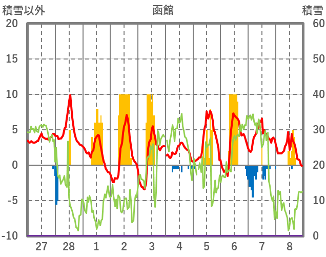 | 日 | 時 | 気温 | 降水 | 風向/風速 | 日照 | 積雪 | 降雪 |