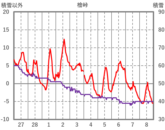 | 日 | 時 | 気温 | 降水 | 風向/風速 | 日照 | 積雪 | 降雪 |